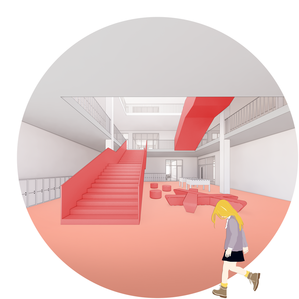 Our solution connects the school and nature in the tightest possible way. It benefits from the proximity to the forest, the sloping site, and the area's character on the edge of the newly settled urban area. By peeling the vegetation surface away and transferring it onto the roof of the ground floor, we have created two complementary worlds. The school's world of the common areas interacting with the city at the streetscape level and the world of learning, movement, and nature above. We then connect the two in several places. But the obvious centre of gravity of the educational adventure is at the top, in its own universe, where nature is a touch close.
