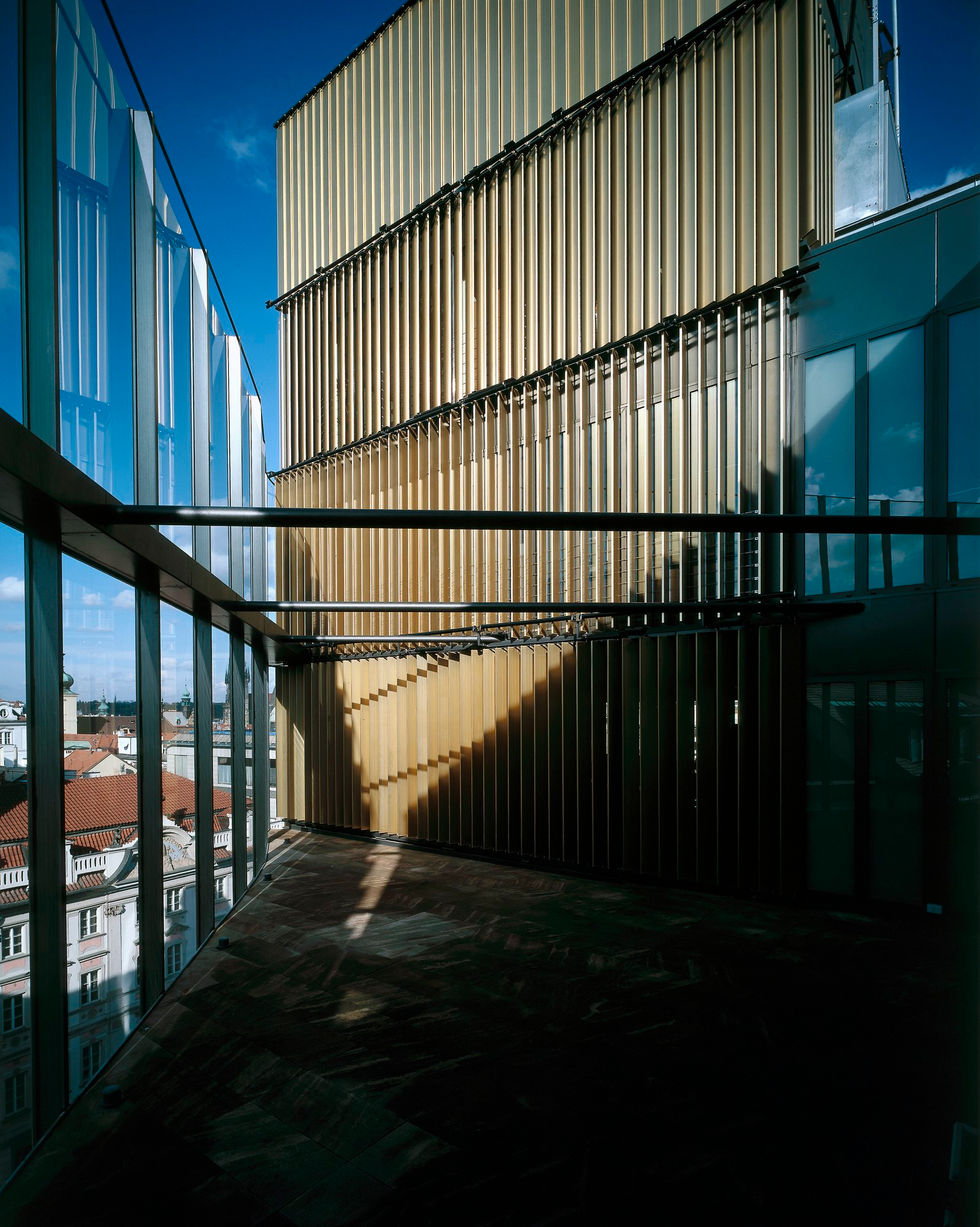 Transparentní skleněný plášť půdorysně modulovaný do křivky tvarované "aerodynamickým" způsobem nehmotně definuje objem nároží — jeho subtilnost je umožněna použitím dvojité skleněné fasády s odvětrávanou vzduchovou mezerou. V druhém plánu se v nároží objevuje kontrastně kubická strohá hmota, tvořená vrstvou nastavitelných clon ve zlaté barvě, které regulují světelnou pohodu interiéru. V nejexponovanějším místě domu pak vnitřní kubus proráží klidnou horizontální hmotu a dává vzniknout dominantě věže — výškové odezvě protějšího nároží s palácem Koruna. Za lehkou slupkou skleněného pláště, který zklidňuje celkové působení stavby, je hmota administrativní části odebírána tam, kde si to žádají vazby na sousední objekty.
